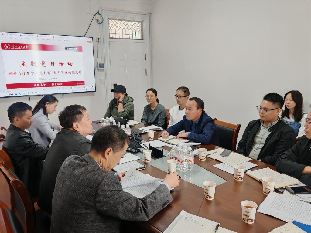 为深入贯彻落实党建引领业务融合的工作思路,推动学校“十五五”信息化规划编制工作高质量开展,10月28日上午,网络与信息中心党支部与资产管理处党支部在屏风校区后勤楼301会议室联合开展主题党日活动。活动由资产管理处党支部书记农庆能同志主持,两个支部党员参加。